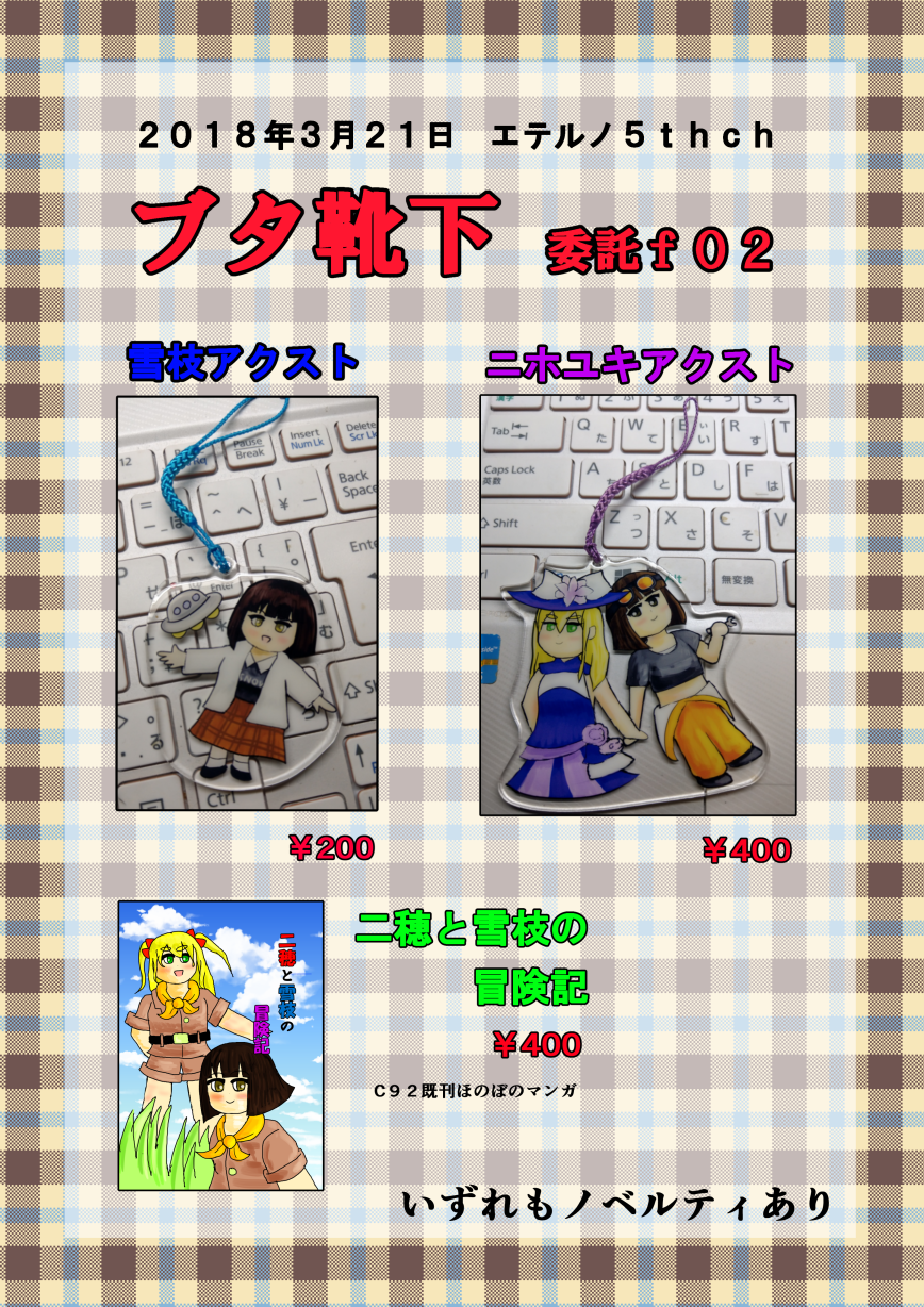 5thchおしながき イラスト 2018年03月12日 いよいよ来週水曜はエテルノ5thchですね!ということで委託だけどおしながき載せときます!ニホユキアクストの方は未公開イラストポスカと公開済みイラストのおまけつきです雪枝アクストのおまけは公開済みイラストポスカのみになります。C92既刊のおまけはC92時でも頒布した透明しおりになります(キャラはランダムです)なお、C92既刊は今回頒布するもので残部すべてになります。またすべての頒布物に次回イベント参加(夏コミC94)の予告チラシを入れてあります。当日はぜひお手に取ってください。 [0回]PR